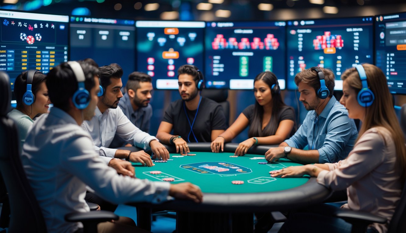 Orang-orang bermain poker online di berbagai perangkat dengan tampilan meja poker digital yang lengkap.